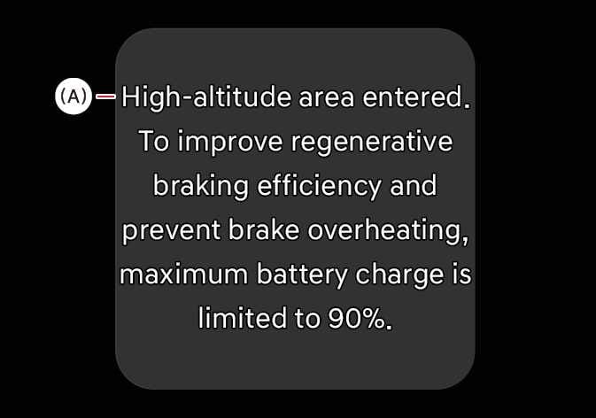 (A): Hochgelegenes Gebiet erreicht. Um die Effizienz des regenerativen Bremsens zu verbessern und eine Überhitzung der Bremsen zu vermeiden, ist die maximale Batterieladung auf 90 % begrenzt. |