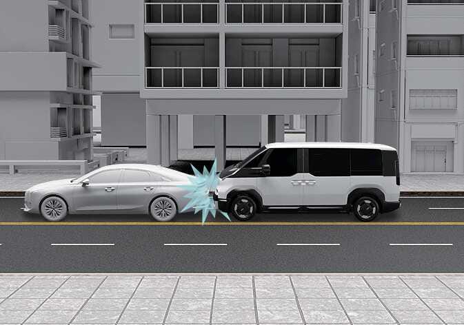 Durch die starke Bremsung neigt sich das Fahrzeug vorn nach unten, so dass die Vorderseite des Fahrzeugs unter ein Fahrzeug mit höherer Bodenfreiheit gelangen kann. Airbags werden in solchen „Unterfahr“-Situationen eventuell nicht ausgelöst, da die von den Sensoren erkannte Aufprallkraft unter diesen Umständen zu gering sein könnte. |