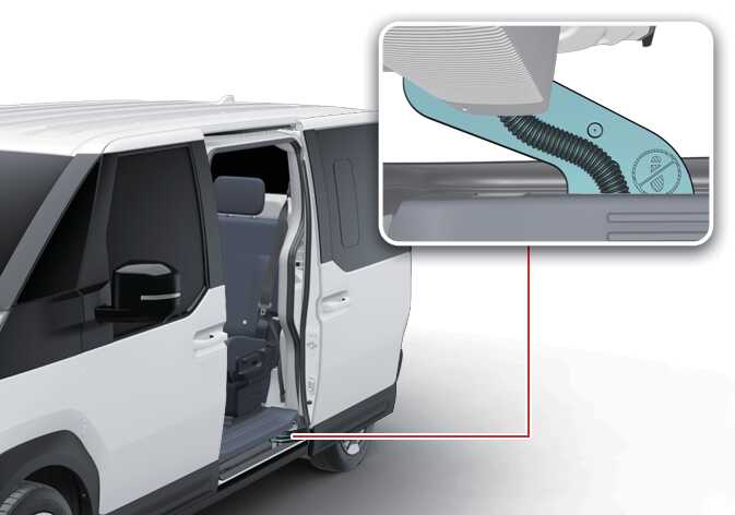 Treten Sie nicht auf das Scharnier und lassen Sie keine schweren Gegenstände auf das Scharnier fallen, wenn Sie bei geöffneter Schiebetür in das Fahrzeug einsteigen oder es verlassen.