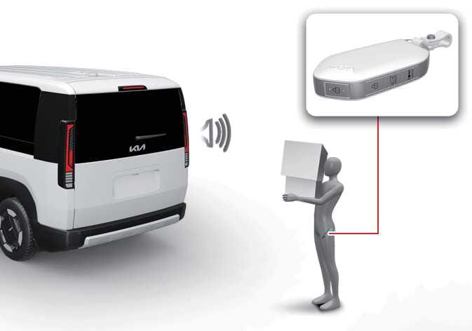 Wenn Sie sich mit einem Smart-Key im Erkennungsbereich (50 bis 100 cm [20 bis 40 Zoll] hinter dem Fahrzeug) befinden, blinken die Warnleuchten und es wird ein Warnton ausgegeben, wenn der Smart-Key erkannt wurde und sich die Heckklappe öffnet.