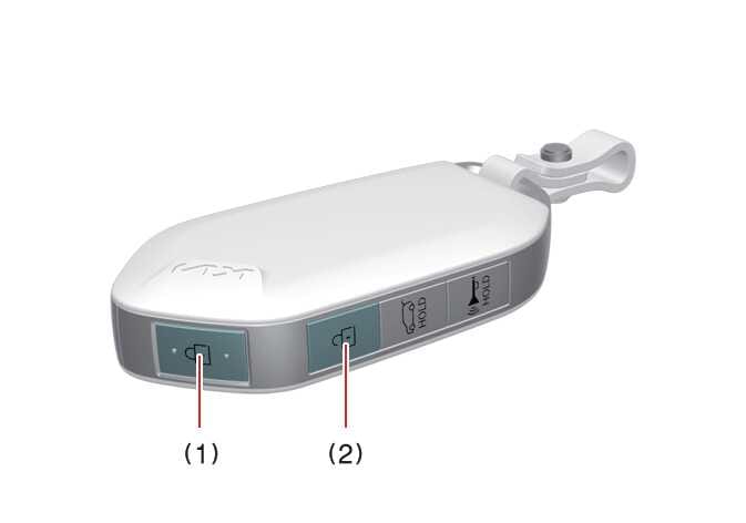 Drücken Sie die Türentriegelungstaste (2) länger als 3 Sekunden. Das Fenster bewegt sich nach unten, nachdem die Türen entriegelt wurden, solange Sie die Türentriegelungstaste (2) drücken.