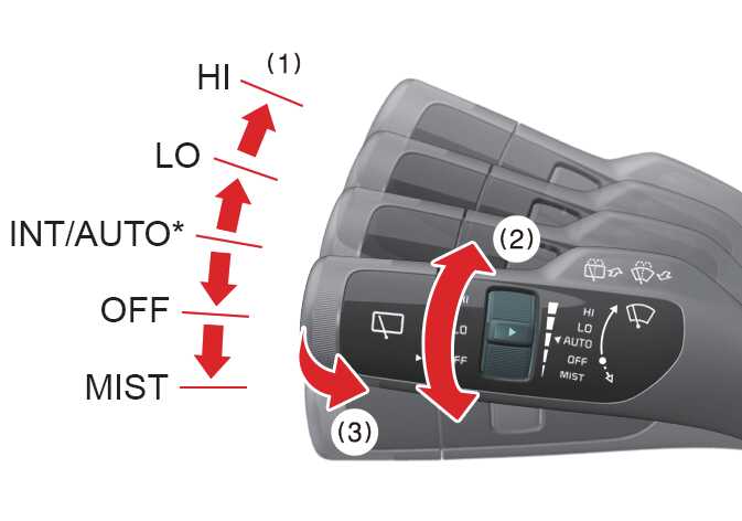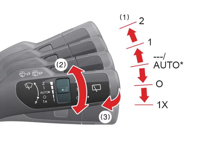 MIST/1x: Für einen Wischzyklus bringen Sie den Hebel in diese Position und lassen ihn dort los. Die Wischer bleiben dauerhaft in Betrieb, wenn der Hebel in dieser Stellung gehalten wird.