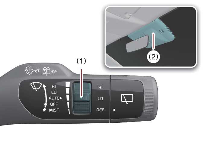 Der Regensensor (2), der sich am oberen Rand der Windschutzscheibe befindet, erkennt die Niederschlagsmenge und steuert die Wischzyklen entsprechend. Bei zunehmendem Niederschlag wischen die Scheibenwischer schneller. Wenn kein Niederschlag mehr fällt, stoppen die Scheibenwischer.