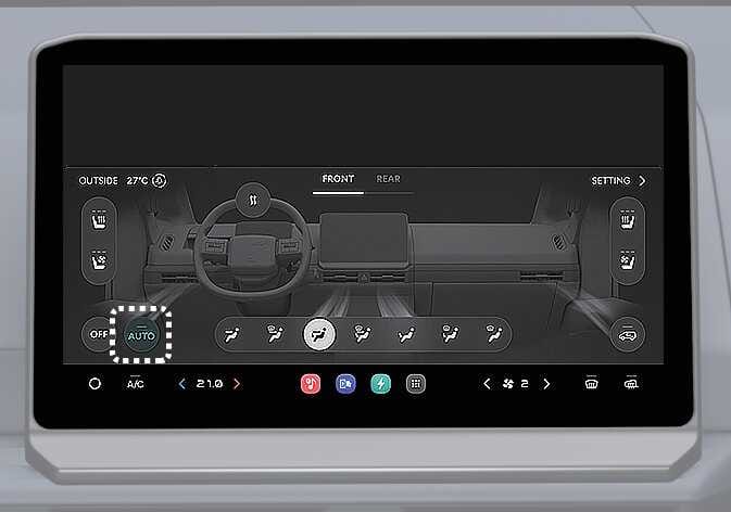 Symbol für die Windschutzscheibenheizung (Tippen Sie das Symbol erneut an, um die Funktion der Windschutzscheibenheizung zu deaktivieren. Die Anzeige „AUTO“ leuchtet erneut auf dem Informationsdisplay auf.