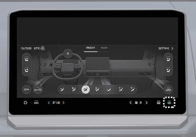 Berühren Sie das Symbol für die Außenspiegelheizung. Die Anzeige über dem Symbol für die Außenspiegelheizung erscheint, wenn die Heizung eingeschaltet (ON) ist.