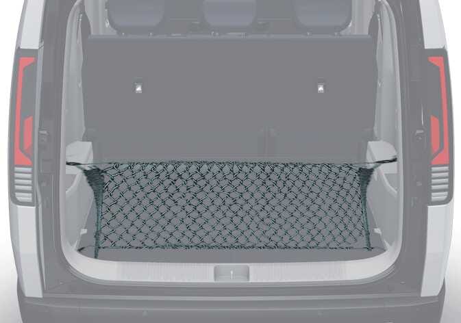 Um zu verhindern, dass Gegenstände im Laderaum verrutschen, können Sie die 4 Halterungen im Laderaum verwenden, um das Gepäcknetz zu befestigen, oder Sie können das Gepäcknetz (ausstattungsabhängig) in der Hälfte zusammenfalten und mit den zusätzlichen 2 Halterungen an jeder Seite nach oben befestigen.