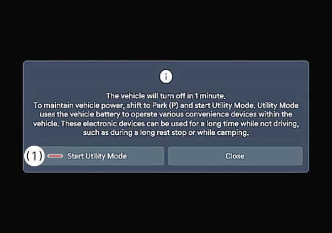 Wenn seit dem Einschalten des Fahrzeugs 14 Minuten vergangen sind POWER ON befindet, erscheint ein Popup-Menü auf dem Infotainment-Bildschirm. Um die Stromversorgung des Fahrzeugs weiter zu nutzen, wählen Sie Standmodus starten auf dem Infotainment-Bildschirm.