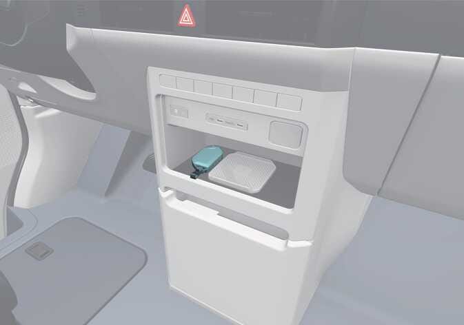 Wenn die Batterie schwach ist oder der Smart-Key nicht richtig funktioniert, können Sie das Fahrzeug starten, indem Sie den Smart-Key neben den Bereich für das kabellose Ladesystem in der Mittelkonsole legen und dann die EV-Taste etwa 10 Sekunden lang in Position OFF drücken.