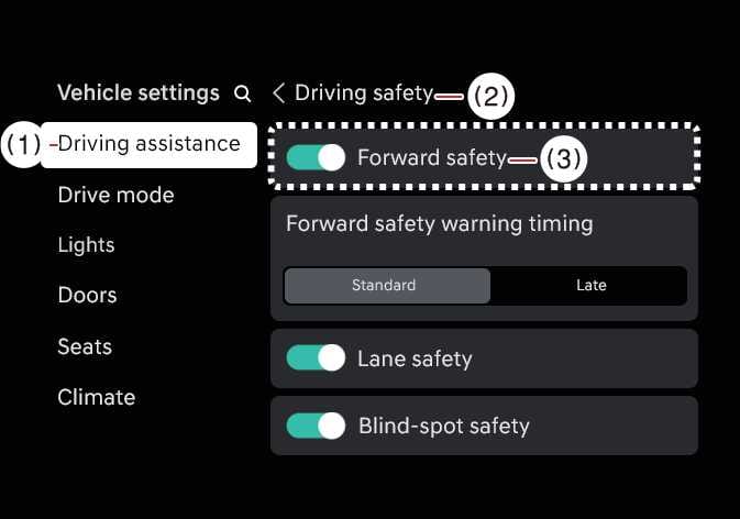 Wählen Sie bei eingeschaltetem Fahrzeug am Infotainment-System . Der Zeitpunkt für die Aktivierung der ersten Warnung des Frontalkollisions-Vermeidungsassistenten kann geändert werden.