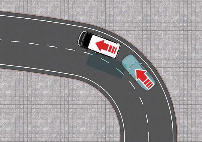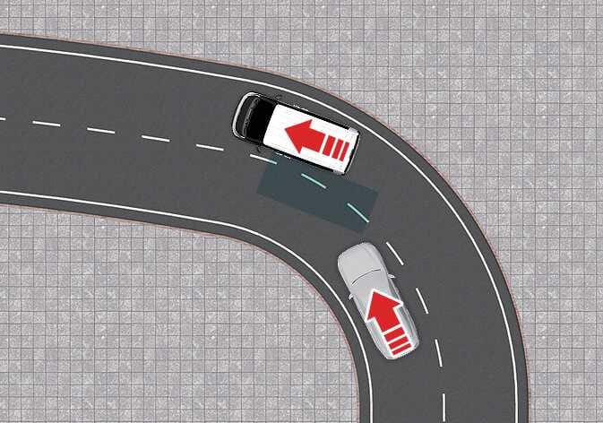 Der Totwinkel-Kollisionsvermeidungsassistent funktioniert nicht ordnungsgemäß, wenn Sie auf einer kurvigen Straße fahren. Der Totwinkel-Kollisionsvermeidungsassistent kann das Fahrzeug in der benachbarten Fahrspur nicht erkennen. Achten Sie immer auf die Straße und die Fahrbedingungen, wenn Sie auf kurvigen Straßen fahren. Der Totwinkel-Kollisionsvermeidungsassistent funktioniert nicht ordnungsgemäß, wenn Sie auf einer kurvigen Straße fahren. Der Totwinkel-Kollisionsvermeidungsassistent kann das Fahrzeug auf derselben Spur nicht erkennen. Achten Sie während der Fahrt immer auf die Straßen- und Fahrbedingungen. |
