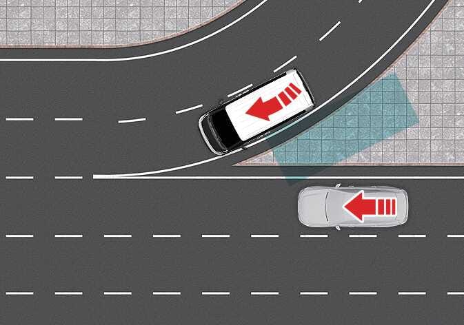 Der Totwinkel-Kollisionsvermeidungsassistent funktioniert möglicherweise nicht richtig, wenn sich Straßen gabeln oder zusammengeführt werden. In bestimmten Fällen erkennt das System das Fahrzeug in der Nachbarspur nicht. Achten Sie während der Fahrt immer auf die Straßen- und Fahrbedingungen an Straßeneinmündungen und Abzweigungen. |