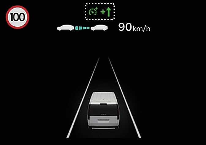 Wenn sich die Geschwindigkeitsbegrenzung der Straße während des Betriebs des manuellen Geschwindigkeitsbegrenzungsassistenten oder der intelligenten Tempomatsteuerung ändert, wird ein nach oben oder unten zeigender Pfeil angezeigt, um den Fahrer zu informieren, dass die eingestellte Geschwindigkeit geändert werden muss. Zu diesem Zeitpunkt kann der Fahrer die eingestellte Geschwindigkeit entsprechend der Geschwindigkeitsbegrenzung ändern, indem er den Schalter (+) oder (-) am Lenkrad betätigt.