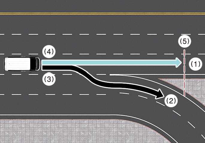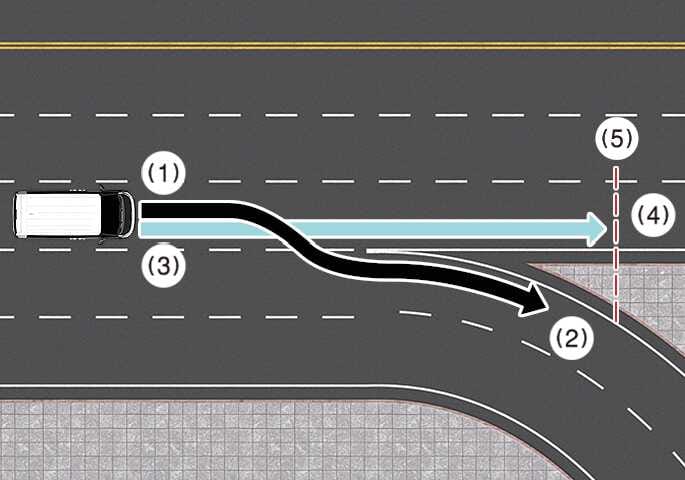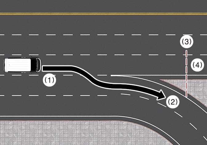 Wenn die navigationsbasierte intelligente Tempomatsteuerung aktiv ist, wenn Sie die Hauptfahrbahn verlassen, um in ein Autobahnkreuz, eine Anschlussstelle oder eine Rastanlage, usw. einzufahren, kann die Funktion noch einige Zeit in Betrieb sein.