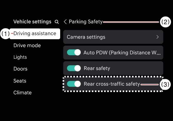 Wählen Sie bei eingeschaltetem Fahrzeug auf dem Bildschirm des Infotainment-Systems , um den Heckverkehr-Kollisionsvermeidungsassistenten einzuschalten.