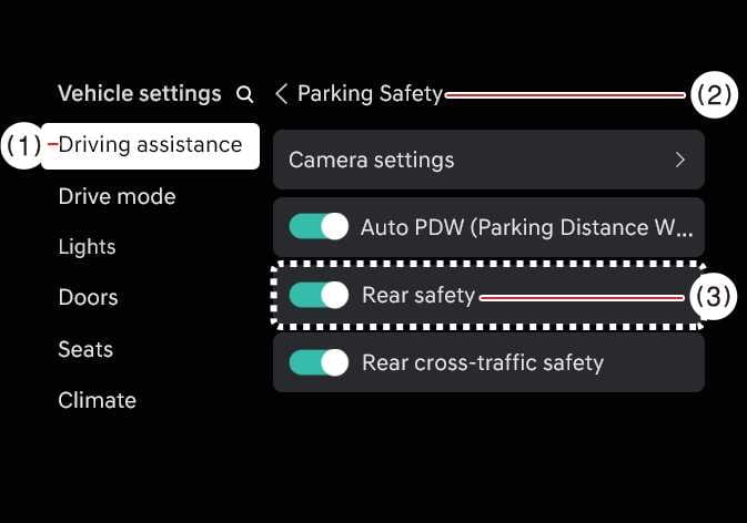 Sicherheit hinten wird ausgewählt und die Einstellungen des Kollisionsvermeidungsassistenten werden bei jedem Neustart des Fahrzeugs beibehalten.