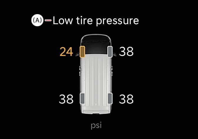 Wenn die Kontrollleuchten des Reifendruck-Überwachungssystems leuchten und eine Warnmeldung auf dem Kombiinstrument angezeigt wird, ist der Reifendruck in mindestens einem Reifen zu niedrig. Die Positionskontrollleuchte für Reifen mit geringem Reifendruck zeigt an, in welchem Reifen der Reifendruck erheblich zu gering ist. Dazu wird die Position des Reifens durch eine Warnleuchte signalisiert.