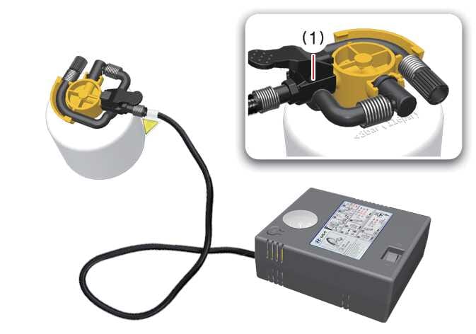 Verbinden Sie den Anschluss des Kompressors mit dem Schlauchanschluss des Kompressors, der sich an der Flasche des Dichtmittels befindet (1). Stellen Sie sicher, dass die Dichtmittelflasche aufrecht steht.