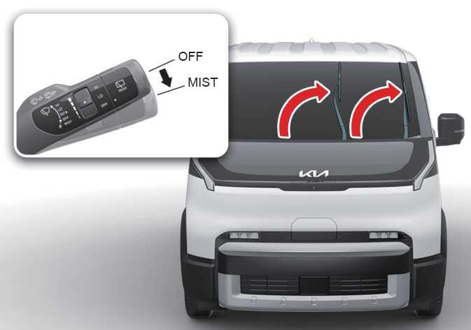 Stellen Sie innerhalb von 20 Sekunden nach dem Ausschalten des Motors den Wischerschalter in die Position für einen einzelnen Wischvorgang (MIST) und halten Sie den Schalter länger als 2 Sekunden gedrückt, um die Wischerblätter senkrecht nach oben zu stellen.