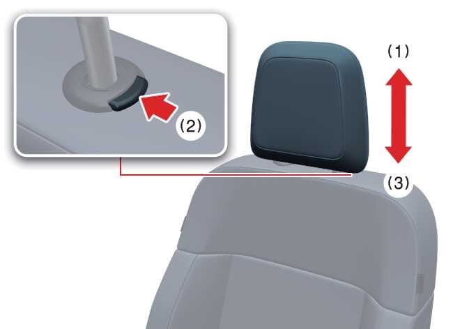 To lower the headrest, push and hold the release button (2) on the headrest support.