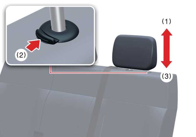 Put the headrest poles (3) into the holes whilst pressing the release button (2).