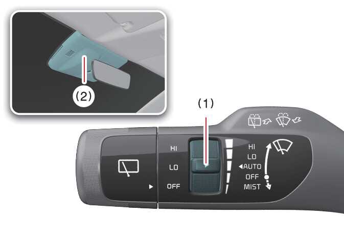 The rain sensor (2) located on the upper end of the windscreen glass senses the amount of rainfall and controls the wiping cycle for the proper interval. The more it rains, the faster the wiper operates. When the rain stops, the wiper stops.