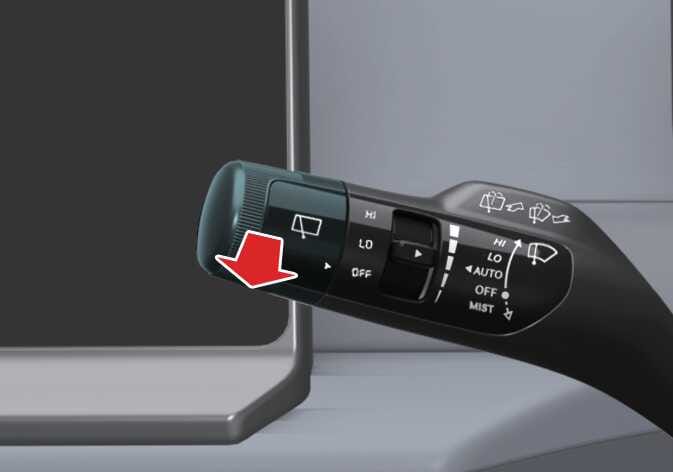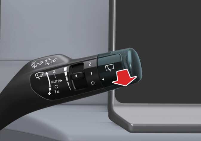 Pull the lever gently toward you to spray washer fluid on the windscreen and to run the wipers 1–3 cycles. Use this function when the windscreen is dirty. The spray and wiper operation will continue until you release the lever.