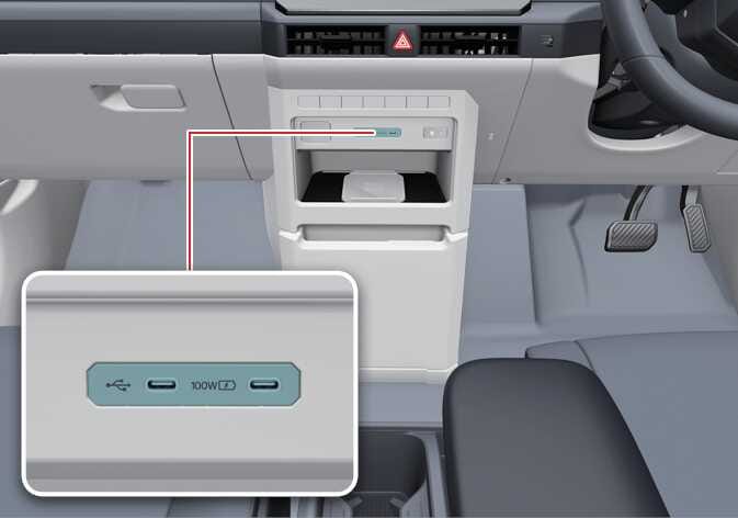 Using the genuine charger specified for your vehicle can support up to 100 W. However, the 100 W USB charger supports 60 W with cables that meet the same specifications as PD 3.0-enabled products, and 27 W otherwise. Use only Kia Genuine Parts or those of an equivalent standard.