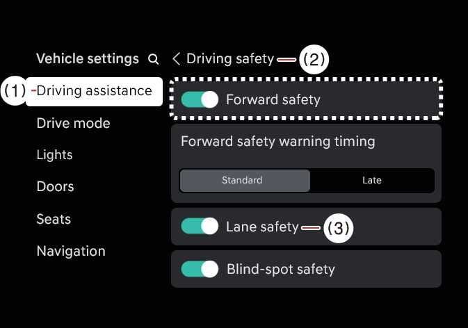 Lane safety: If Lane safety is selected, Lane Keeping Assist will automatically assist the driver's steering when lane departure is detected to help prevent the vehicle from moving out of its lane. If Lane safety is deselected, the yellow indicator light (