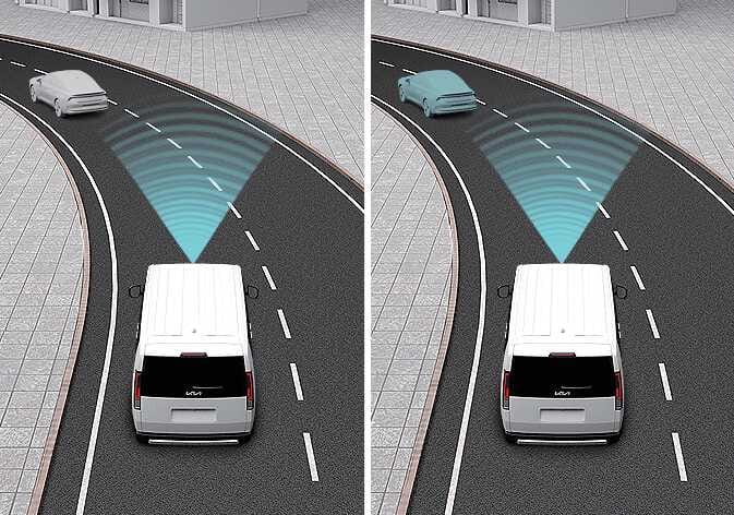 On curves, Smart Cruise Control may not detect a vehicle in the same lane, and may accelerate to the set speed. Also, vehicle speed may rapidly decrease when the vehicle ahead is detected suddenly. Select the appropriate set speed on curves and apply the brake pedal or accelerator pedal according to the road and driving conditions ahead. Your vehicle speed can be reduced due to a vehicle in the adjacent lane. Check to be sure that the road conditions permit safe operation of Smart Cruise Control and if necessary, depress the brake pedal to reduce your driving speed in order to maintain a safe distance |