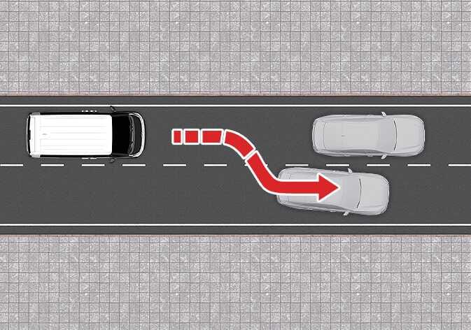 When a vehicle (2) moves into your lane from an adjacent lane, it cannot be detected by the sensor until it is in the sensor's detection range. Smart Cruise Control may not immediately detect the vehicle when the vehicle changes lanes abruptly. In this case, you must maintain a safe braking distance, and if necessary, depress the brake pedal to reduce your driving speed in order to maintain a safe distance. |