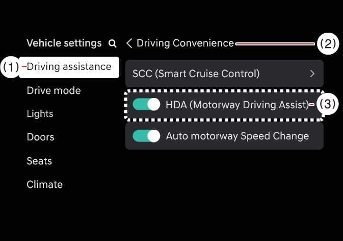 If HDA (Highway Driving Assist) is selected, it helps maintain distance from the vehicle ahead, maintain the set speed, and helps centre the vehicle in the lane.