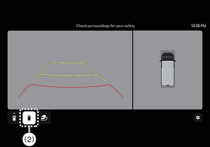 Pressing the view switching button (2) on the Surround View Monitor to select the rearview, rear top view, rear side view, or rear wide view.