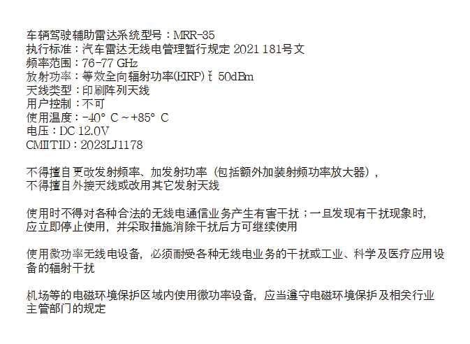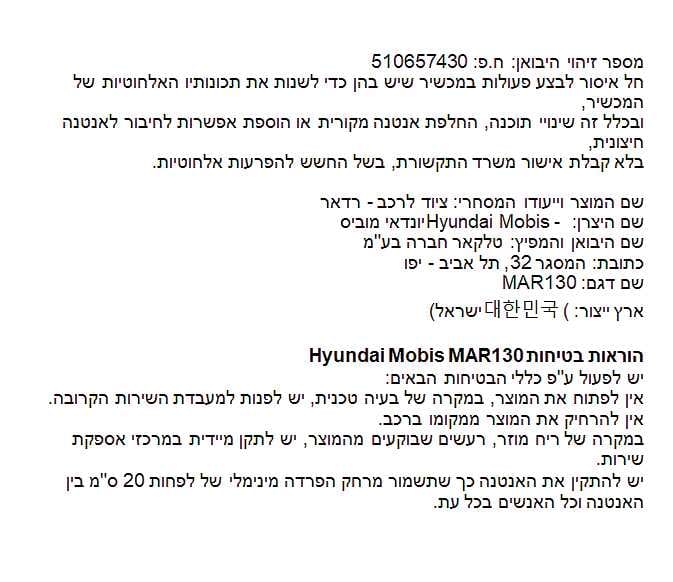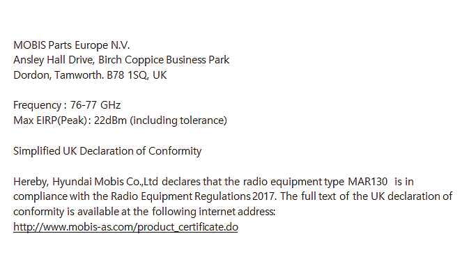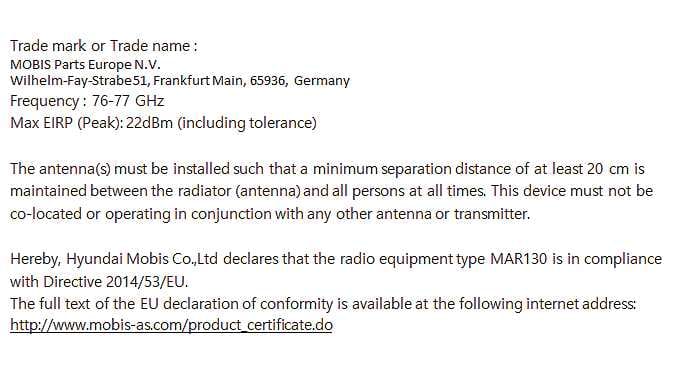 The radio frequency components (Front Corner Radar/Rear Corner Radar) complies (if equipped):