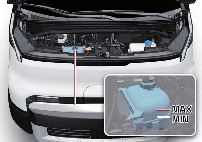 The coolant level should be filled between the MAX or F and the MIN or L marks on the side of the coolant reservoir when the parts in the motor compartment is cool.