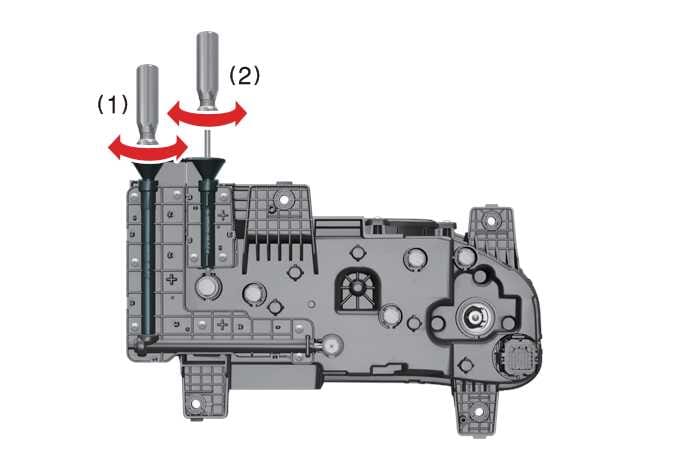 To aim the low beam left or right, turn the screwdriver (1) clockwise or counterclockwise. To aim the low beam up or down, turn the screwdriver (2) clockwise or counterclockwise.